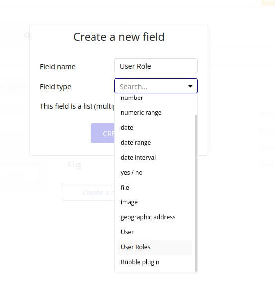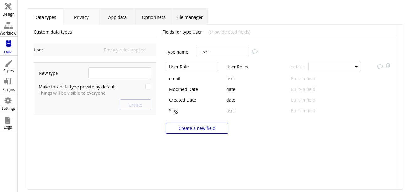 1.2. By now, we have created an options set. But we need to link it with users inside our bubble application. To ensure that options set will be attached to each user we need to go to: ‘Data types’ tab. After, look at the list of types under ‘Fields for type User’. There should be a field of type ‘User Roles’.