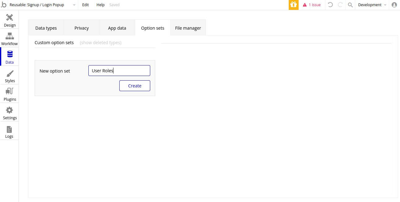 1.1. To create a new Option set, go to the Data tab, then click ‘Option sets’. Input title of new set inside ‘New option set’ field. Lets call our option set as ‘User Roles’ and click Create button