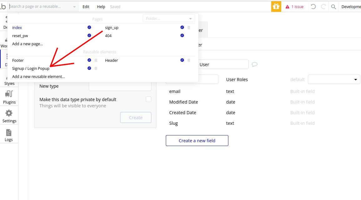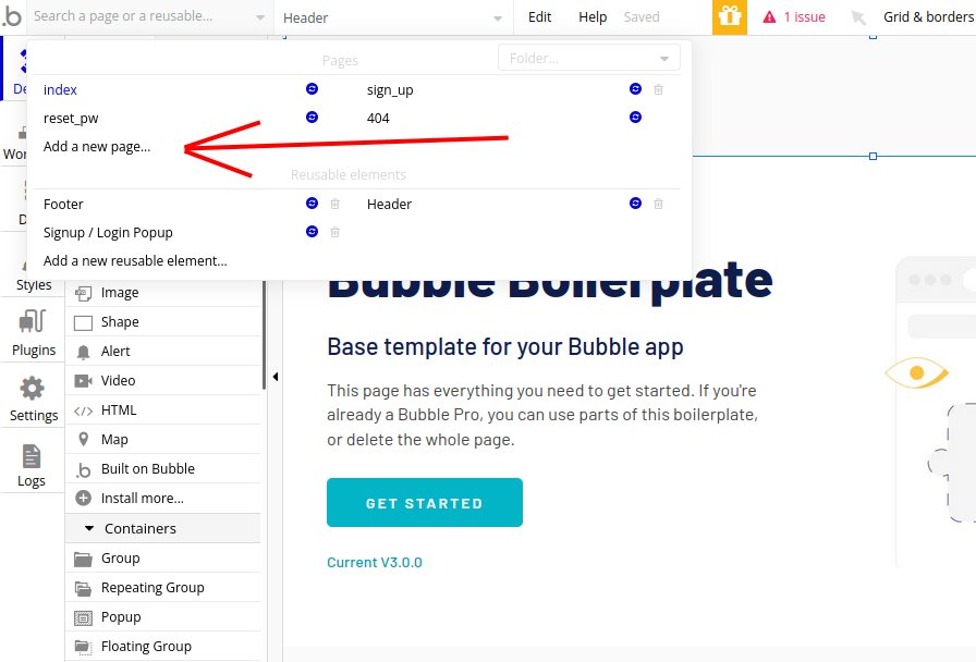 3.1. Add a new signup page. For this open drop-down in the left top and click Add new page… Let’s name it signup . Click Create button