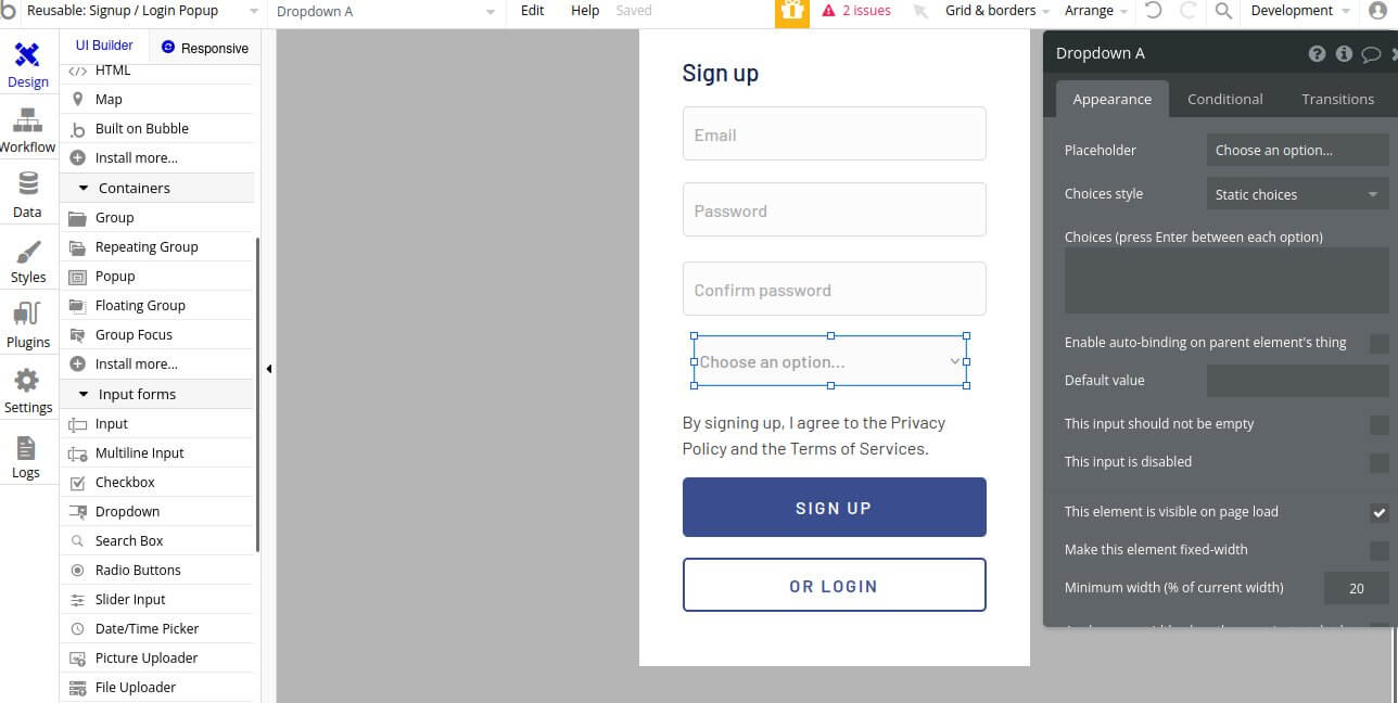 Each application in the bubble. by default, should contain a ‘Signup/Login Popup’ reusable block. This block can be used on many pages . This block contains all needed form controls used for sign up or/and login users.