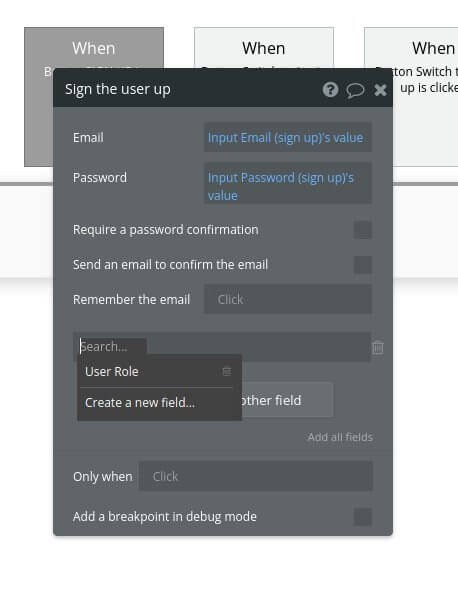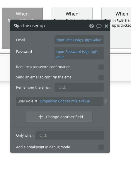 After selecting the Account sub-menu and then ‘Sign the user up’ menu item. In the ‘Element Inspector’ you need to click the ‘Change another field’ button. Select ‘User Role’ from list in .