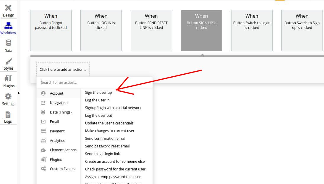 It opens a page where you can configure action. Click on ‘Sign the user up’ action or add a new action. To add a new action you need to click on a box with text ‘Click here to add an action..’