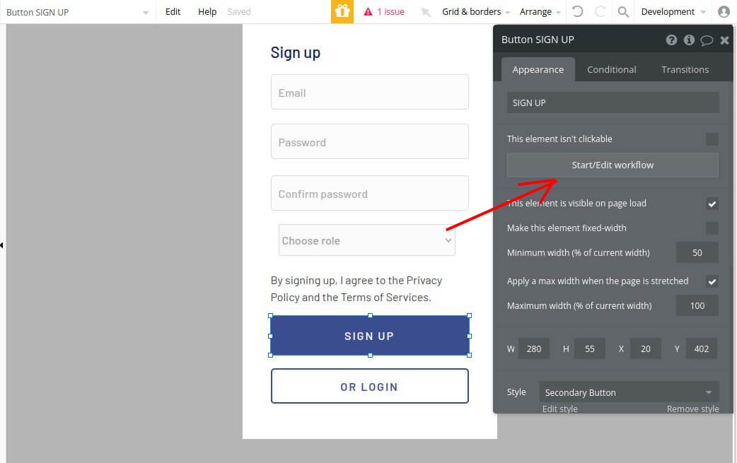 2.3. Next, we need to tell bubble what to do when the user clicks on the ‘Sign Up’ button inside the registration form. For this you need to double click on this button. It opens ‘Element Inspector’ where you can add workflow. Click on the ‘Start/Edit workflow’ button.